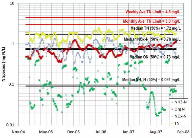 如果單獨對某個污水處理廠做一點深入的分析還會得到一些其他信息,WesternBranch污水處理廠的處理規(guī)模約12萬噸/日,出水TN月均值要求達(dá)到3mg/L,周均達(dá)到4.5mg/L,處理工藝采用三段式活性污泥法。