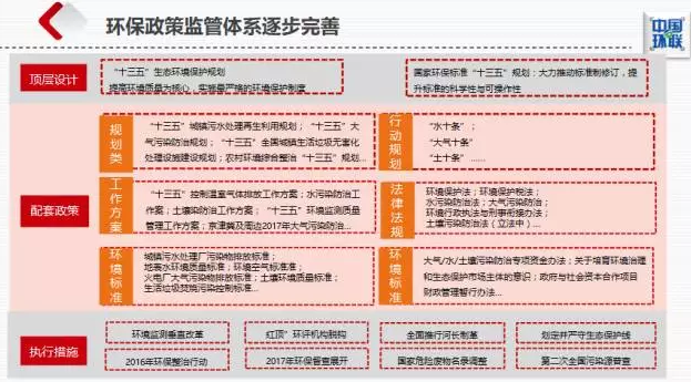 2017年以來(lái),環(huán)保監(jiān)管體系重構(gòu):從頂層政策,如“十三五”生態(tài)環(huán)境保護(hù)規(guī)劃,到水、氣、固、土壤的配套政策,再到環(huán)保垂改、專項(xiàng)整治等具體措施,三位一體重構(gòu)環(huán)保政策監(jiān)管體系,強(qiáng)調(diào)治理效果,提升監(jiān)管力度。在責(zé)任主體、監(jiān)管體系、排污收費(fèi)、排污許可、排污權(quán)交易等五個(gè)方面進(jìn)行重大改革,從多個(gè)方面吸引社會(huì)力量共同改善環(huán)境質(zhì)量,把過(guò)去被動(dòng)化、模糊化的管理變?yōu)榱酥鲃?dòng)化、定量化、清晰化的管理。