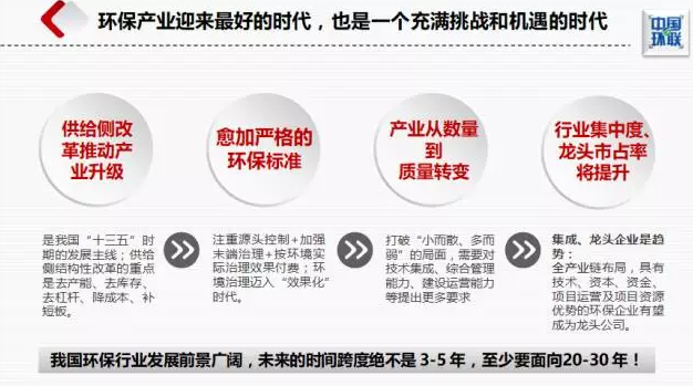 供給側(cè)改革是我國(guó)“十三五”時(shí)期的發(fā)展主線,而環(huán)保是推進(jìn)供給側(cè)改革的重要手段。十九大進(jìn)一步明確了“綠水青山就是金山銀山”的戰(zhàn)略思想,我國(guó)的環(huán)保產(chǎn)業(yè)發(fā)展正迎來(lái)最好的時(shí)代,環(huán)保標(biāo)準(zhǔn)將越來(lái)越高,環(huán)境治理邁入“效果化”時(shí)代,環(huán)保產(chǎn)業(yè)將經(jīng)歷從數(shù)量到質(zhì)量的變化。與此同時(shí),并購(gòu)持續(xù),行業(yè)集中度提升,擁有較強(qiáng)技術(shù)集成能力、綜合管理能力、建設(shè)運(yùn)營(yíng)能力的龍頭企業(yè)市場(chǎng)占有率將穩(wěn)步提升。我國(guó)環(huán)保行業(yè)發(fā)展前景廣闊,未來(lái)的時(shí)間跨度絕不是 3-5 年,至少要面向20-30 年。