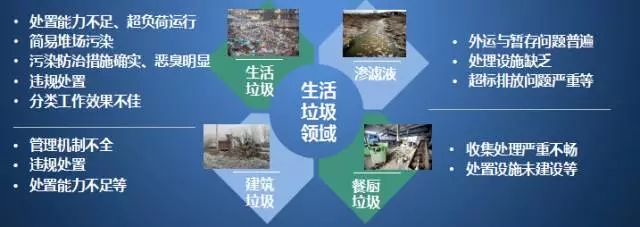 2016.1.4至2017.5.28三批中央環(huán)保督察工作中暴露了環(huán)衛(wèi)領(lǐng)域存在問題:生活垃圾處理設(shè)施不足/違規(guī)處置/隨意傾倒嚴(yán)重、簡(jiǎn)易垃圾填埋場(chǎng)存在、滲濾液偷排或超標(biāo)排放嚴(yán)重、建筑垃圾管理不善、生活垃圾分類工作滯后和臭氣擾民等。