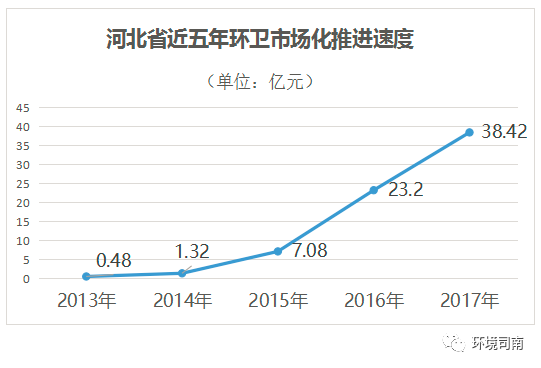 2013年河北省全省的環(huán)衛(wèi)市場化規(guī)模不足5000萬元,2014年也僅有1.32億元。進(jìn)入2015年后,在國家層面的政策利好頻頻出臺的基礎(chǔ)上,河北省連續(xù)三年出臺相關(guān)政策措施,環(huán)衛(wèi)市場化規(guī)模呈現(xiàn)出爆發(fā)式增長態(tài)勢。2015年市場規(guī)模直接由1.32億跳升到7.08億,2016年拉升到23.2億,2017年繼續(xù)保持強勁增勢,截止11月30日,2017年度市場化規(guī)模已接近40億元。
