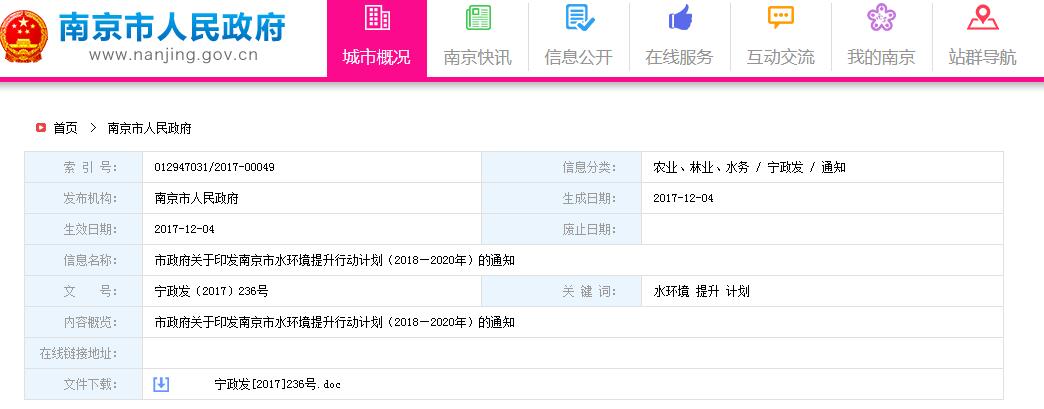 市政府關(guān)于印發(fā)南京市水環(huán)境提升行動計劃(2018—2020年)的通知