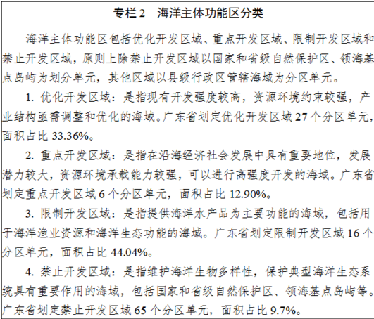 對海洋優(yōu)化開發(fā)區(qū)域,調(diào)整相鄰陸域優(yōu)化產(chǎn)業(yè)和人口布局。海洋優(yōu)化開發(fā)區(qū)主要分布在珠三角、湛江市區(qū)和汕頭市區(qū)等。規(guī)劃對汕頭市區(qū)、珠三角和湛江市區(qū)海洋優(yōu)化開發(fā)區(qū)域相鄰區(qū)域的產(chǎn)業(yè)和人口布局進行優(yōu)化與調(diào)整,涉及面積1946平方千米。
