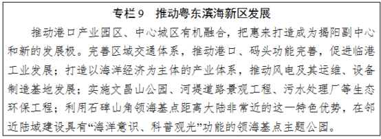 城市發(fā)展。中心城區(qū)以空港新城、揭東新城為重點,加快產(chǎn)業(yè)集聚和設(shè)施完善,提升承載力和輻射力;惠來以大南海石化區(qū)建設(shè)為重點,促進產(chǎn)城融合發(fā)展;推動粵東濱海新區(qū)發(fā)展,打造揭陽城市副中心。