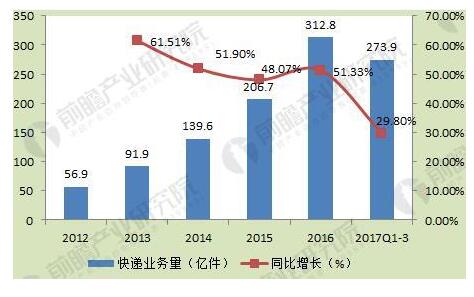 圖表3:2012-2017年前三季度中國快遞業(yè)務(wù)量走勢(單位:件,%)