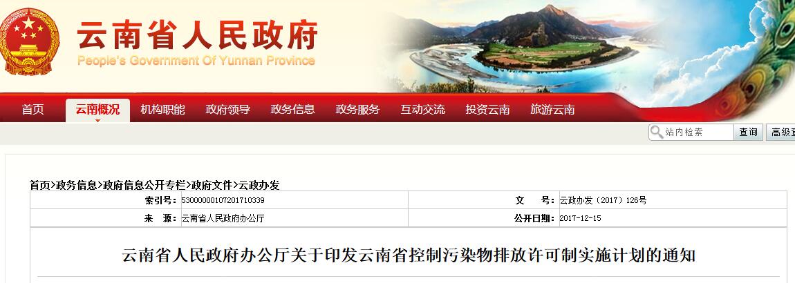 云南省人民政府辦公廳關(guān)于印發(fā)云南省控制污染物排放許可制實(shí)施計劃的通知