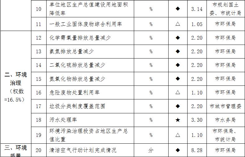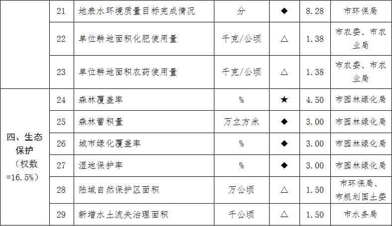 2.“資源利用”“生態(tài)環(huán)境保護(hù)”類各子目標(biāo)采用專項(xiàng)考核部門組織開展專項(xiàng)考核認(rèn)定的數(shù)據(jù)。考核指標(biāo)未覆蓋的區(qū),對(duì)應(yīng)的指標(biāo)分值分?jǐn)傊猎搮^(qū)同類別其他指標(biāo),保持“資源利用”“生態(tài)環(huán)境保護(hù)”一級(jí)指標(biāo)總分不變。