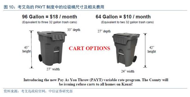 PAYT制度通常下的定價模式有全單位定價模式、部分單位定價及浮動定價等三種模式。以全單位定價的PAYT模式為例,居民首先需要購買由當(dāng)?shù)卣y(tǒng)一印刷的標(biāo)牌,并將標(biāo)牌粘貼到一定容量的垃圾袋上;或者根據(jù)自己產(chǎn)生垃圾量大小向政府申請垃圾桶,政府根據(jù)垃圾桶大小而收費(fèi)。以夏威夷州的考艾島為例,該地區(qū)在2015年7月開始實行PAYT制度,居民可以選擇兩種尺寸的垃圾桶,一種是96加侖的垃圾桶,每月需付費(fèi)18美元,一種是64加侖的垃圾桶,每月需付費(fèi)10美元,一個64加侖的車,每月10美元。