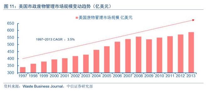 根據(jù)WasteBusinessJournal統(tǒng)計,美國市政廢物管理市場規(guī)模自1997年的341億美元持續(xù)攀升至2013年的589億美元,期間復(fù)合增速為3.5%,高于同期人口增速和廢物產(chǎn)生量增速。受金融危機(jī)影響,市場規(guī)模自2008年的55.7億元略微下滑至2009年的53.7億元,但在2011年即恢復(fù)至金融危機(jī)前的水平。