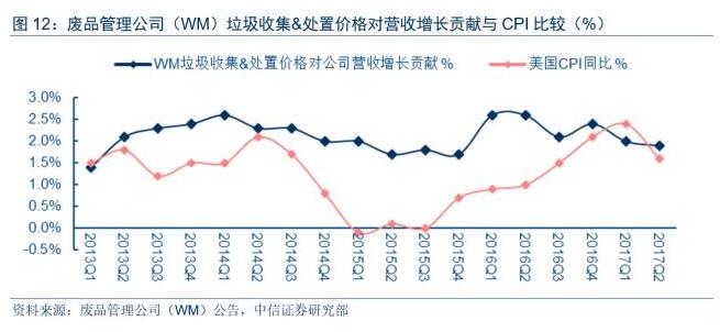 集中度提升&產(chǎn)業(yè)鏈打通塑造美國環(huán)衛(wèi)公司定價能力:美國環(huán)衛(wèi)龍頭公司定價能力突出,其通過持續(xù)提升處理費(fèi),有效規(guī)避廢物量增速放緩的不利影響,如廢品管理公司(WM)2013年迄今的季度均價均維持上漲,且單季度同比漲幅超過同期CPI漲幅。美國環(huán)衛(wèi)及后端處置市場高度集中以及前后端產(chǎn)業(yè)鏈打通的市場結(jié)構(gòu),是美國環(huán)衛(wèi)公司獲取定價能力的關(guān)鍵要素,而定價能力又最終轉(zhuǎn)化為企業(yè)優(yōu)異的盈利能力和股票市場優(yōu)異表現(xiàn)。