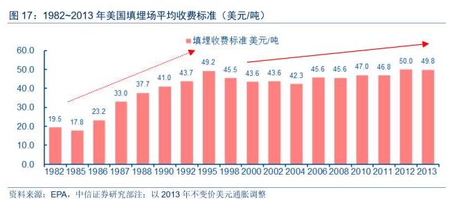 美國市政廢物的填埋平均價格自1985年的17.8美元/噸上升至1995年的49.2美元/噸,10年間價格漲幅接近3倍,收費(fèi)上漲的主要原因是監(jiān)管加嚴(yán)和標(biāo)準(zhǔn)提升帶動填埋場的建造和運(yùn)營成本上升明顯,此階段是典型的成本拉動型價格上漲。在2000年之后,廢物填埋收費(fèi)呈現(xiàn)溫和且持續(xù)的上漲,自2000年的43.6美元/噸溫和上漲至2013年39.8美元/噸,2000~2013年價格復(fù)合增速為1.1%,通脹及寡頭壟斷的市場結(jié)構(gòu)是該階段價格上漲的重要推動力。