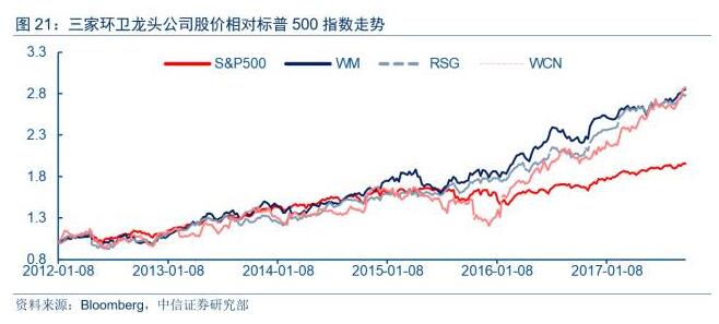 高股息率、不依賴外部融資和突出的定價能力對投資具有較強(qiáng)吸引力。從公司股價相對標(biāo)普指數(shù)走勢看,三家環(huán)衛(wèi)龍頭股價均顯跑贏標(biāo)普500指數(shù),具有較明顯的相對收益。