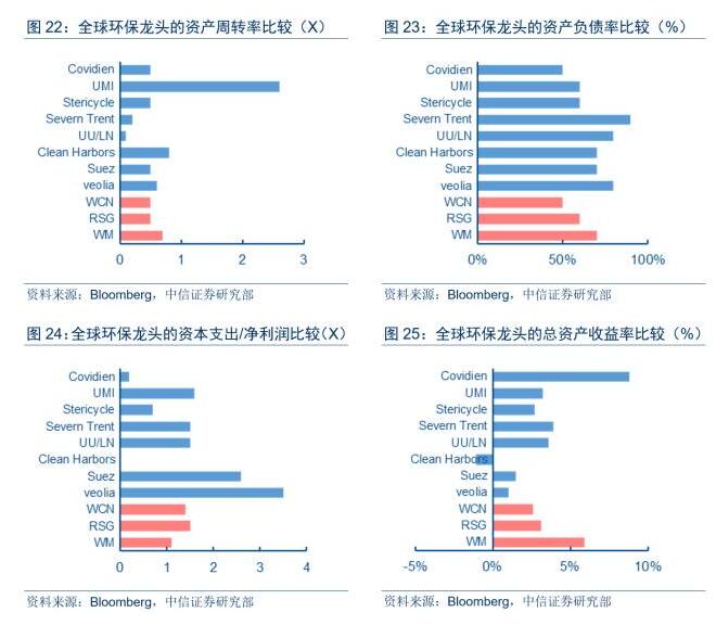 為厘清環(huán)衛(wèi)公司的商業(yè)模式為輕資產(chǎn)還是重資產(chǎn),我們選取了總資產(chǎn)收益率(ROA)、資產(chǎn)周轉(zhuǎn)率、資產(chǎn)負(fù)債率、資本支出/凈利率等4個財務(wù)指標(biāo),將廢品管理(WM)等3家美國環(huán)衛(wèi)公司的財務(wù)比率與國際上的水務(wù)、固廢、危廢領(lǐng)域代表公司進(jìn)行對比,可以看出美國環(huán)衛(wèi)公司的資產(chǎn)周轉(zhuǎn)率和資產(chǎn)負(fù)債率處于行業(yè)平均水平,資本支出/凈利潤略低于行業(yè)平均,由此可見美國環(huán)衛(wèi)公司的重資產(chǎn)特征突出。以資產(chǎn)周轉(zhuǎn)率為例,2016年,廢品管理(WM)、共和服務(wù)(RSG)、廢物聯(lián)合公司(WCN)三家公司的資產(chǎn)周轉(zhuǎn)率分別為0.7x、0.5x、0.5x,和蘇伊士、威立雅的0.5x、0.6x基本接近。