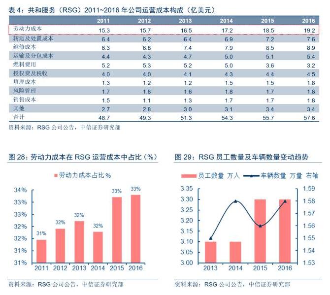 美國生活垃圾的清掃與收集基本實現(xiàn)完全機(jī)械化,由居民先行實施垃圾分類處理,環(huán)衛(wèi)工人直接通過駕駛特制裝載車收集社區(qū)住戶附近垃圾桶內(nèi)的廢棄物,然后將市政廢物運(yùn)往垃圾轉(zhuǎn)運(yùn)中心或者最終處理設(shè)施。以共和服務(wù)(RSG)為例,從員工數(shù)量和公司機(jī)械設(shè)備數(shù)量看,RSG的員工數(shù)量和車輛數(shù)量大體維持在2:1的水平;在2011~2016年公司運(yùn)營成本構(gòu)成中,勞動力成本在公司運(yùn)營成本占比穩(wěn)定維持在31%~33%的區(qū)間內(nèi),顯著低于國內(nèi)環(huán)衛(wèi)市場中的勞動力成本占比。由此可見,通過持續(xù)不斷的機(jī)械化替代,廢物管理市場各參與方的勞動力成本規(guī)模和占比確實可以實現(xiàn)有效控制。