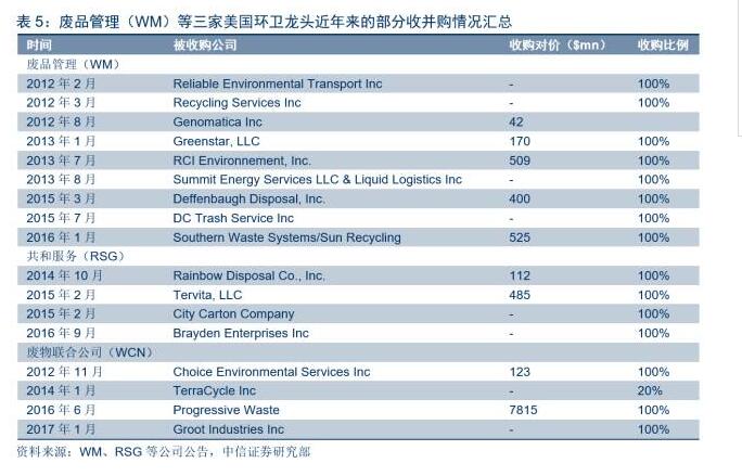 在市政廢物管理市場目前面臨廢物產(chǎn)生量增長緩慢和資源循環(huán)利用的不利因素下,通過外延并購也是企業(yè)提升收入和加速成長的重要手段。廢品管理(WM)等三家龍頭公司在過去幾年中持續(xù)實施外延并購,以提升市場占有率和企業(yè)定價能力。從并購對象標(biāo)的類型看,大型及小型公司、前端收集及后端處置公司等均有涉及。