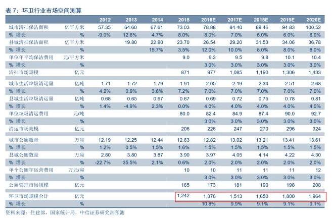 目前城市道路年清掃市場價格普遍在8~12元/平方米,假設(shè)2015年國內(nèi)清掃均價為9元平方米;清運(yùn)均價普遍在70~90元/噸,假設(shè)2015年國內(nèi)清運(yùn)均價為80元/噸;國內(nèi)公廁維護(hù)價格普遍在8~12萬區(qū)間內(nèi),假設(shè)2015年國內(nèi)公廁年維護(hù)均價為10萬元;我們假設(shè)清掃、清運(yùn)及公廁維護(hù)價格的年均漲幅為3%,和通脹水平基本接近;