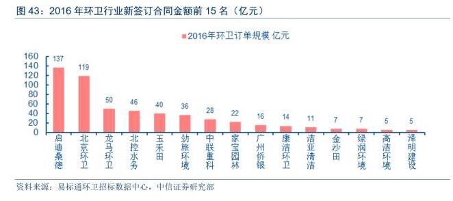 盡管參與企業(yè)眾多,但隨著資本快速進(jìn)入,龍頭企業(yè)開始快速跑馬圈地,環(huán)衛(wèi)市場訂單逐步在向具有資金&資源&管理的優(yōu)勢企業(yè)集中。根據(jù)易標(biāo)通環(huán)衛(wèi)招標(biāo)數(shù)據(jù)中心統(tǒng)計數(shù)據(jù),按照合同規(guī)模排名,2016年國內(nèi)環(huán)衛(wèi)市場簽約規(guī)模前5名企業(yè)為啟迪桑德、北京環(huán)衛(wèi)、龍馬環(huán)衛(wèi)、北控水務(wù)、玉禾田等,簽約合同規(guī)模分別為137、119、50、46、40億元。2016年前15名企業(yè)的合同簽約規(guī)模合計為542億元,占全國新簽環(huán)衛(wèi)服務(wù)合同總規(guī)模的62.9%。