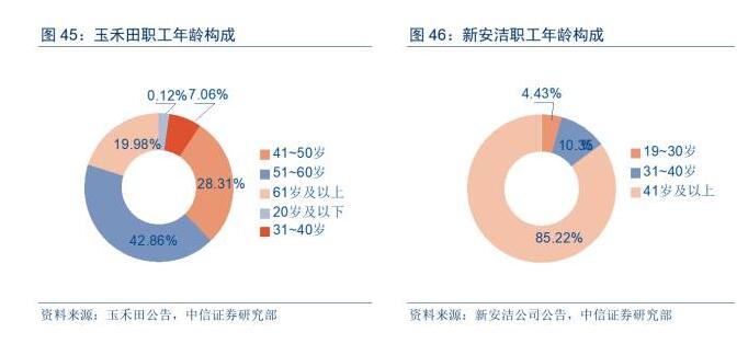 目前國內(nèi)環(huán)衛(wèi)行業(yè)的勞動力密度程度高且勞動力老齡化問題突出。環(huán)衛(wèi)服務(wù)業(yè)很多從業(yè)人員已經(jīng)超過退休年齡。從玉禾田和新安潔兩家環(huán)衛(wèi)公司職工年齡統(tǒng)計可以看到,40歲以上員工占大部分,其中51歲以上比例也不小。如果只對環(huán)衛(wèi)一線員工進(jìn)行統(tǒng)計,老齡員工占比會進(jìn)一步提升。向前看,老齡化未來會隨著人口紅利的喪失會變得更加突出。