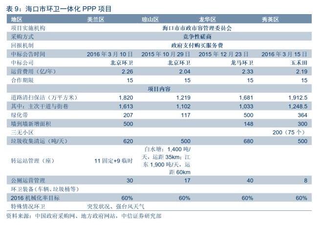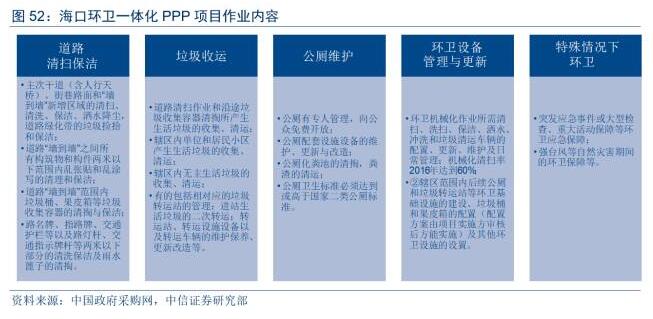 在國家及地方一系列環(huán)衛(wèi)市場化政策推動下,環(huán)衛(wèi)服務(wù)業(yè)市場化項目規(guī)模迅速擴(kuò)大。目前已有許多以PPP模式運(yùn)營的環(huán)衛(wèi)項目完成招標(biāo)。在招標(biāo)時,一種模式為環(huán)衛(wèi)一體化的整體處理項目,包含道路清掃、垃圾清運(yùn)、公廁維護(hù)等分項的項目;除上述模式外,將環(huán)衛(wèi)與后端垃圾焚燒發(fā)電、餐廚及污泥處置等項目綜合打包也開始變得頻繁起來。其中海口環(huán)衛(wèi)一體化PPP項目以及固原市循環(huán)經(jīng)濟(jì)產(chǎn)業(yè)園及環(huán)衛(wèi)一體化項目分別為上述模式的典型案例。