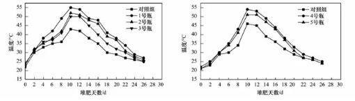 本實(shí)驗(yàn)分為兩個(gè)周期進(jìn)行,每個(gè)周期大約進(jìn)行1個(gè)月。按照文獻(xiàn)的方法,第一周期以中藥渣與污泥的不同質(zhì)量配比進(jìn)行設(shè)計(jì)實(shí)驗(yàn),研究其堆體的理化性質(zhì)以及有關(guān)酶活性的變化,共分為3個(gè)堆肥發(fā)酵罐,編號(hào)為1、2、3號(hào)瓶,配比分別是60g(中藥渣)+300g(污泥)、120g(中藥渣)+240g(污泥)、180g(中藥渣)+180g(污泥)。通過(guò)第一周期的實(shí)驗(yàn)得出一個(gè)效果較好的質(zhì)量配比,第二周期在中藥渣與污泥質(zhì)量配比相同的前提下,進(jìn)行不同的中藥渣投加時(shí)間的分析,分別編號(hào)為4、5號(hào)瓶,4號(hào)瓶在實(shí)驗(yàn)開(kāi)始階段即投加中藥渣,5號(hào)瓶在堆肥的第10d投加中藥渣。在一、二周期均進(jìn)行對(duì)照組實(shí)驗(yàn),堆體全部為360g污泥。