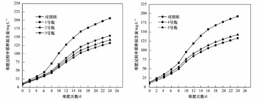 由圖3可知,前6d兩周期的揮發(fā)氨累積量沒(méi)有明顯的變化,但均呈現(xiàn)上升的趨勢(shì),堆肥進(jìn)行第8d到第18d是氨氮損失量最大的區(qū)段,之后由于溫度降低,有機(jī)物的消耗以及微生物的活動(dòng)減弱,氨氮損失量變小,慢慢趨向穩(wěn)定。未投加中藥渣時(shí),對(duì)照組堆體的氨氮揮發(fā)累積量達(dá)到了206.5mg˙L-1,而1號(hào)瓶(60g中藥渣+300g污泥)堆體的氨氮揮發(fā)累積量?jī)H為132.2mg˙L-1,與對(duì)照組相比減少了35.9%,原因在于微生物的固氮是需要碳源的,但城市污泥中的C/N往往不足,因此微生物的固氮能力差,導(dǎo)致了氮的損失嚴(yán)重;而中藥渣富含碳源,可以調(diào)整堆體的C/N,從而使微生物能更好的發(fā)揮其固氮作用。