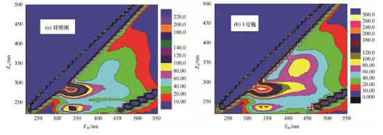 為了更全面地分析DOM,本實(shí)驗(yàn)采用熒光分析儀對(duì)對(duì)照組與1號(hào)瓶堆體第10d的DOM三維熒光光譜特征進(jìn)行了分析,如圖6所示。在不同堆體中均出現(xiàn)了可見(jiàn)光區(qū)類(lèi)腐殖酸峰A(Ex/Em=310~360nm/400~450nm),紫外光區(qū)類(lèi)腐殖酸峰B(Ex/Em=250~280nm/420~450nm),類(lèi)蛋白熒光峰C(Ex/Em=250~280nm/320~380nm)及簡(jiǎn)單芳香蛋白熒光峰D(Ex/Em=220~250nm/300~380nm),添加中藥渣的堆體,其類(lèi)腐殖酸峰更強(qiáng),表明堆肥腐殖化程度更好,添加外源有機(jī)質(zhì)有利于提高堆肥的腐殖化程度。有研究認(rèn)為BIX在0.6~0.7之間時(shí),DOM主要為陸源輸入,外源輸入特征明顯,而本研究中BIX分別為0.73和0.80,證明了堆肥過(guò)程中DOM主要來(lái)源為自生源。FI是評(píng)價(jià)DOM來(lái)源的依據(jù):FI<1.4來(lái)源于陸地輸入,F(xiàn)I>1.4時(shí)來(lái)自于微生物分解,對(duì)照組和處理組FI為1.57和1.53,表明微生物對(duì)有機(jī)物的降解也是堆肥形成的主要原因。