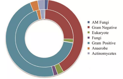通過(guò)PLFA技術(shù)可獲得生態(tài)環(huán)境中微生物群落在數(shù)量與結(jié)構(gòu)方面的信息,具有較高的準(zhǔn)確性、穩(wěn)定性與敏感性,因此被應(yīng)用于堆肥樣品、土壤以及污泥等的微生物群落研究。PLFA技術(shù)在對(duì)技術(shù)與儀器條件要求相對(duì)較低的情況下,可以確定土壤、污泥中微生物的生物量分布;更重要的是,從PLFA的組分中還可以得到較完整的“存活”微生物群落在數(shù)量與結(jié)構(gòu)方面的信息,因此,本研究利用PLFA對(duì)第25d對(duì)照組與1號(hào)瓶進(jìn)行了分析,結(jié)果如圖7所示。