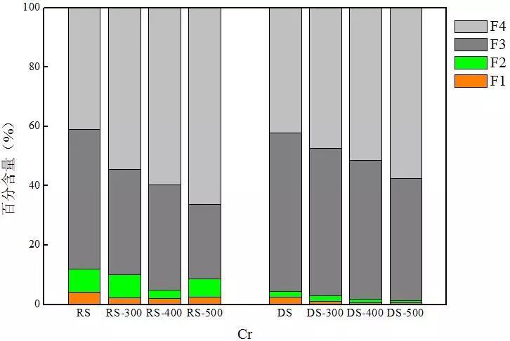 對比兩種熱解炭中Cr的分布可以發(fā)現(xiàn),消化污泥熱解炭中穩(wěn)定態(tài)Cr含量均高于同等溫度下生污泥熱解炭,尤其是F3態(tài)Cr的含量。以300 ℃熱解炭為例,RS-300和DS-300中F3態(tài)Cr的含量分別為35.4%和49.7%。這可能是因?yàn)樯勰嘀泻写罅康暮蚧衔?S含量達(dá)到1.97%),在厭氧環(huán)境下Cd更易形成硫化物,使消化污泥中F3態(tài)含量高于生污泥,從35.5%增加到53.5%,進(jìn)而導(dǎo)致消化污泥熱解炭中F3態(tài)Cr含量高于生污泥熱解炭。
