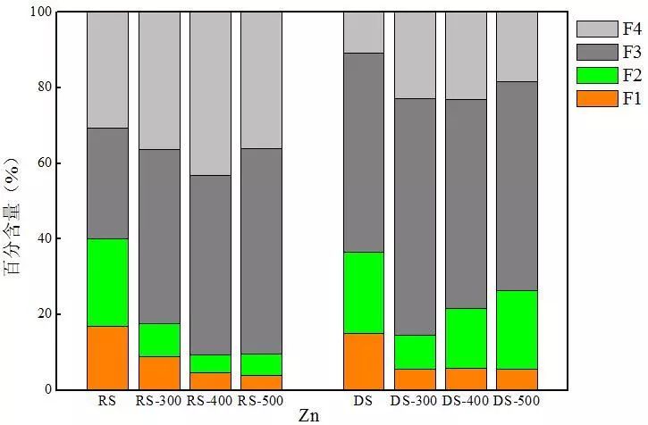 生污泥熱解炭隨熱解溫度升高,穩(wěn)定態(tài)含量增加,500 ℃下達(dá)到90.4%。而消化污泥熱解炭中Zn的穩(wěn)定態(tài)含量卻表現(xiàn)減小的趨勢,在300 ℃熱解條件下穩(wěn)定態(tài)含量最大,為85.5%。兩種熱解炭中F3態(tài)金屬含量較原污泥均有大幅度的提升,以生污泥熱解炭為例,生污泥中F3態(tài)金屬含量為30%,而500 ℃下熱解炭中F3態(tài)金屬含量卻達(dá)到了54%。對比兩種熱解炭的重金屬分布可以發(fā)現(xiàn),消化污泥熱解炭中的非穩(wěn)態(tài)Zn含量高于生污泥熱解炭,但消化污泥熱解炭中F3態(tài)Zn含量卻顯著高于生污泥熱解炭,這可能也是厭氧消化后污泥中F3態(tài)Zn含量大幅度增加所導(dǎo)致。