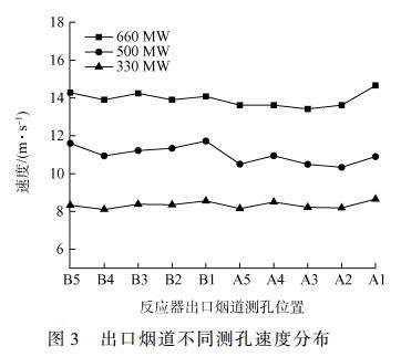 圖3為反應器出口煙道的速度場分布示意圖,從圖可知,出口煙氣流速與負荷關(guān)系密切,且與測孔位置有關(guān)。3種負荷工況下,B側(cè)速度均值分別為14.1、11.3、8.4m?s-1,A側(cè)均值分別為13.8、10.6、8.3m?s-1,均值比分別為1.02、1.07、1.00。