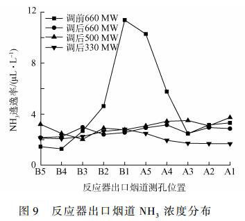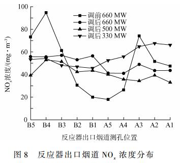 可知,機組調(diào)前在660MW負荷下,均值濃度分別為56、43.5mg?m-3,但不同測孔的NOx濃度差異較大,其中B側(cè)NOx濃度最大偏差為74.7mg?m-3、而A側(cè)為56.2mg?m-3。噴氨格柵優(yōu)化調(diào)整后,NOx均值濃度基本不變,而在660、500、330MW負荷下,NOx濃度差異性均明顯降低,B側(cè)最大偏差分別降至3.9、13.6、8.6mg?m-3,而A側(cè)對應偏差分別為7.9、7.0、15.1mg?m-3。