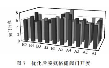 調(diào)前、調(diào)后噴氨格柵閥門開度分別見圖6、圖7。