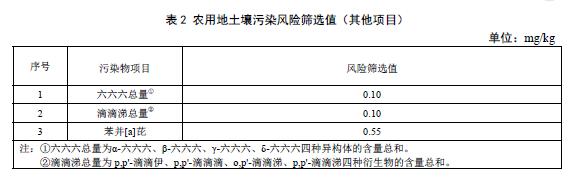 4.2.1農(nóng)用地土壤污染風(fēng)險篩選值的其他項目為選測項目,包括六六六、滴滴涕和苯并[a]芘,風(fēng)險篩選值見表2。