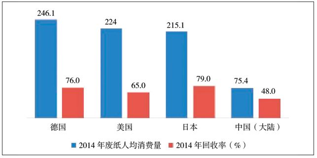 圖22014年中國內(nèi)地人均紙年消費量及廢紙回收率比較