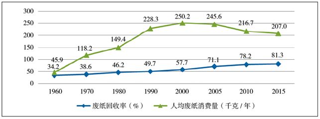 圖31960~2015年日本人均紙年消費量及廢紙回收率
