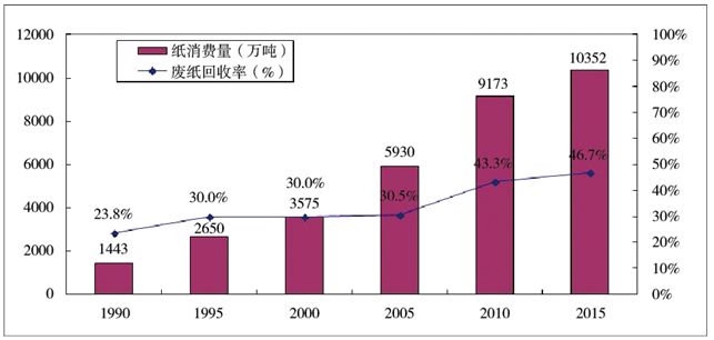 圖61990~2015年內(nèi)地紙消費量以及廢紙回收率