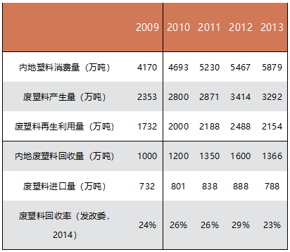 廢塑料是生活垃圾可回收物中增長最快的部分。根據(jù)《中國資源綜合利用年度報告(2014),國家發(fā)展改革委員會》公布的數(shù)據(jù)(見下表),2009~2013年我國廢塑料回收利用率為23%~29%。