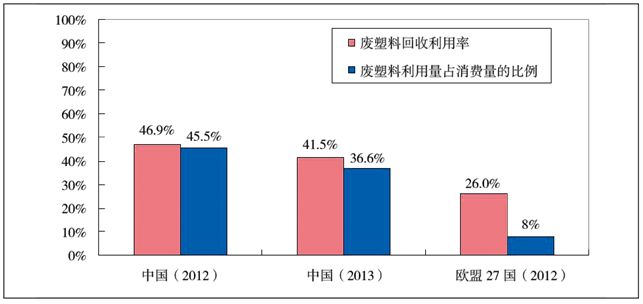 圖10中國內(nèi)地與歐盟廢塑料回收利用比例對比