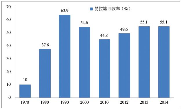圖12美國1970~2014鋁制易拉罐回收率