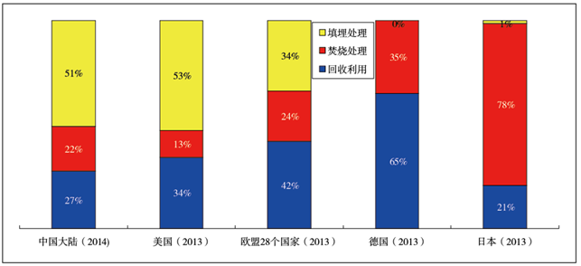 由于不同國家統(tǒng)計口徑不同,簡單比較生活垃圾回收利用率并不能完全反映回收利用水平。根據(jù)中國內(nèi)地廢紙回收量,通過類比法估算出2014年中國內(nèi)地生活垃圾回收利用水平約為27%,名義上高于日本,低于美國、歐洲以及德國,但實際并非如此。日本的生活垃圾回收利用率約為21%,美國生活垃圾回收利用率為34%,但實際上日本的生活垃圾回收利用水平明顯高于美國。例如,近幾年,美國的鋁制易拉罐回收率只有50~55%,而日本鋁制易拉罐回收率達到90%以上。美國的塑料回收利用率約為10%,而日本則達到20~22%。