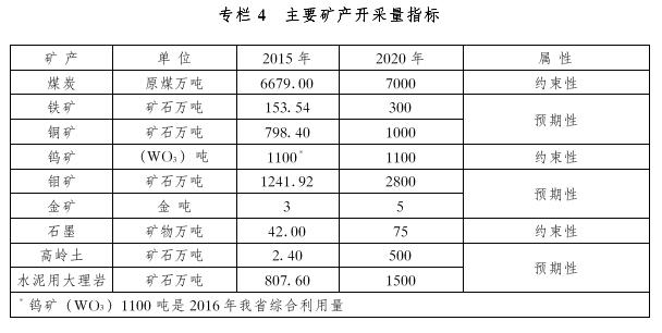1.礦業(yè)對(duì)國(guó)民經(jīng)濟(jì)的支撐作用得到進(jìn)一步增強(qiáng)。轉(zhuǎn)變發(fā)展方式,調(diào)整礦業(yè)結(jié)構(gòu),穩(wěn)定石油產(chǎn)量,壓縮煤炭過(guò)剩產(chǎn)能,大力發(fā)展石墨、鉬等新材料精深加工業(yè),到2020年全省采礦業(yè)產(chǎn)值力爭(zhēng)達(dá)到2500億元。