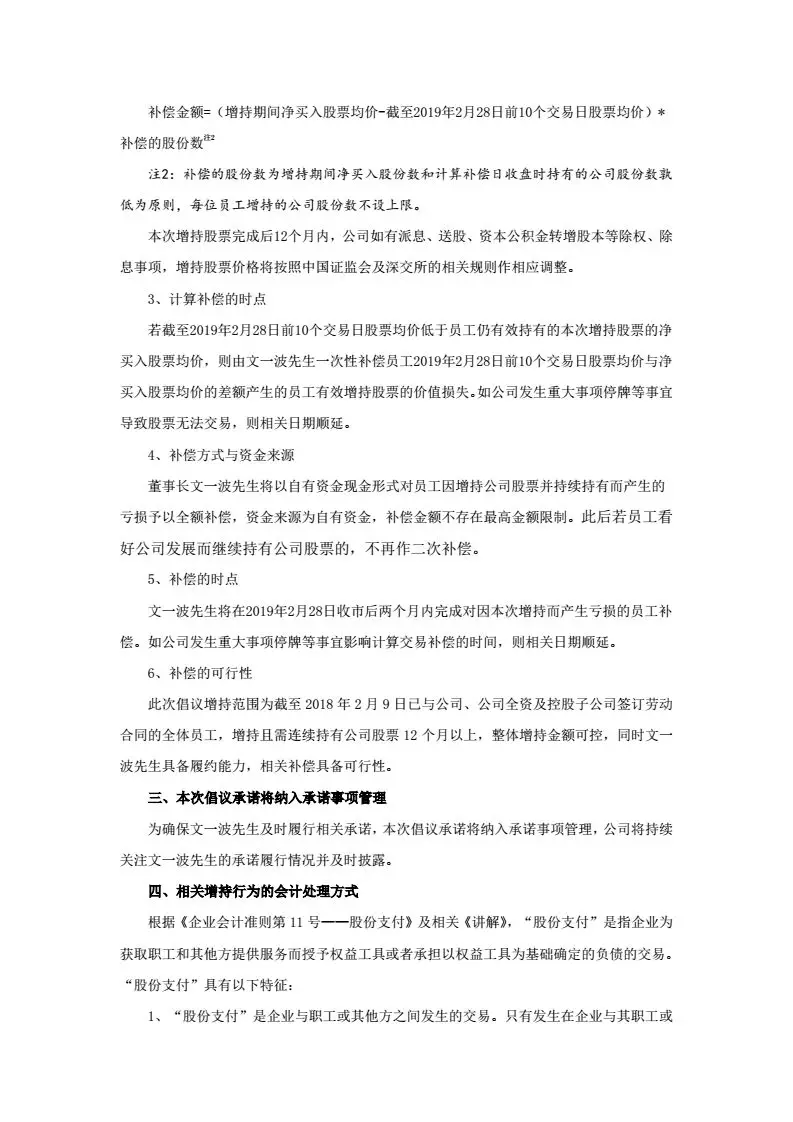 二、補(bǔ)償不設(shè)上限。“董事長(zhǎng)文一波先生將以自有資金現(xiàn)金形式對(duì)員工因增持公司股票并持續(xù)持有而產(chǎn)生的虧損予以全額補(bǔ)償,資金來(lái)源為自有資金,補(bǔ)償金額不存在最高金額限制。”換句話說(shuō)就是,虧多少,補(bǔ)多少,你虧,董事長(zhǎng)補(bǔ)!