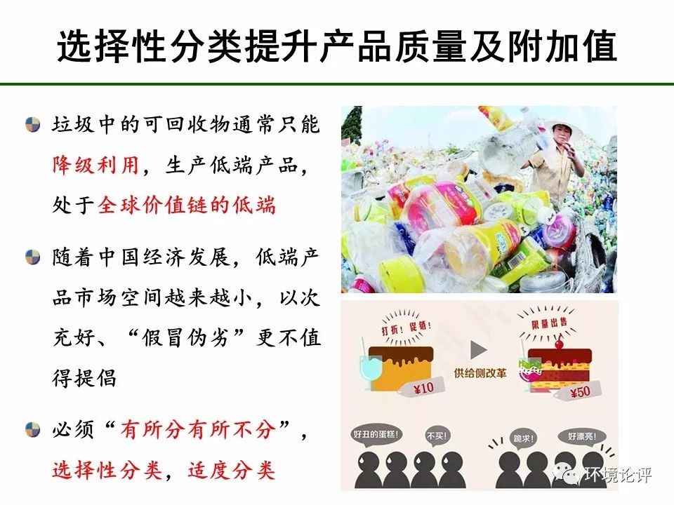 我國當(dāng)前大力推行的供給側(cè)結(jié)構(gòu)性改革實(shí)際上大大提升了垃圾分類產(chǎn)物回收利用的準(zhǔn)入門檻,常態(tài)化的嚴(yán)格環(huán)保督查與“洋垃圾”入境禁令又大大壓縮了“散、亂、污”再生資源回收企業(yè)的生存與發(fā)展空間,“高質(zhì)量發(fā)展”也意味著過去量大質(zhì)次、薄利多銷的低端再生產(chǎn)品將逐步退出歷史舞臺(tái)。可以預(yù)期,短時(shí)間之內(nèi)我國生活垃圾源頭分類的準(zhǔn)確性不可能很高,現(xiàn)階段追求“量大”,其后果往往是一堆垃圾勉強(qiáng)分成組分略有差異的幾堆垃圾,以其為原料只能生產(chǎn)大量低端再生產(chǎn)品,而且要付出較高的經(jīng)濟(jì)成本或環(huán)境代價(jià)。低端再生產(chǎn)品市場(chǎng)空間越來越小,反過來又對(duì)垃圾源頭分類造成沖擊。因此,現(xiàn)階段推行垃圾分類,應(yīng)著眼于居民分類習(xí)慣的真正養(yǎng)成與生態(tài)環(huán)境質(zhì)量的整體改善,采取選擇性分類策略,更加注重分出產(chǎn)物的“質(zhì)精”而非“量大”。有了“質(zhì)精”的分類產(chǎn)物,才可能有高質(zhì)量的再生產(chǎn)品,才能有效切斷“散、亂、污”企業(yè)的原料供給,促進(jìn)再生資源回收行業(yè)轉(zhuǎn)型升級(jí),實(shí)現(xiàn)“高質(zhì)量發(fā)展”。