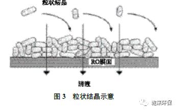 3.2膜面結(jié)晶:膜面結(jié)晶是RO 膜應(yīng)用的重要議題。按結(jié)晶理論,結(jié)晶狀態(tài)通??煞譃榱罱Y(jié)晶和膜面結(jié)晶。當(dāng)溶液達到溶解度極限范圍時,分子相互碰撞產(chǎn)生晶體,晶體是不溶解的粒狀固體,隨水流方向壓到膜面上。粒狀晶體堆在膜面上比較松散,或隨著水流沖到濃液出口,因此粒狀結(jié)晶不會對膜通量帶來太大影響。粒狀結(jié)晶見圖3。