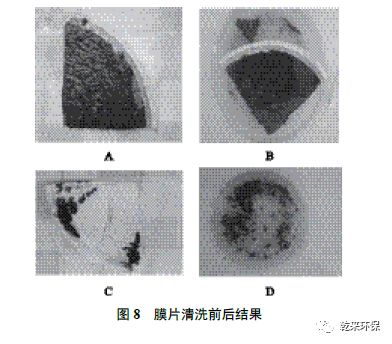 由表1 和表2 可知,震動膜產(chǎn)水水質(zhì)滿足回用要求,但膜通量和清洗周期還未達到設(shè)計標(biāo)準(zhǔn)。圖8 為膜面在清潔前后的觀察結(jié)果。