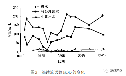 從圖3 可知,生化處理后出水的BOD 也相當(dāng)平穩(wěn),最大值為12. 5 mg/L,平均值為6. 9 mg/L??偺幚砺蕿?4. 1 % 。
