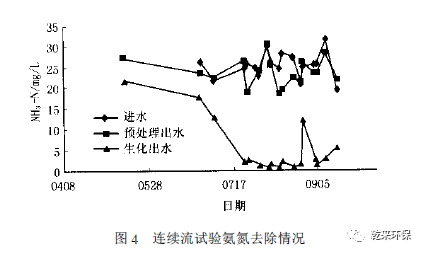 2. 4. 2 氨氮的去除:從圖4 可知,在6 月24 日之前,系統(tǒng)幾乎沒有去除氨氮的效果,且經(jīng)常出現(xiàn)出水氨氮略高于進(jìn)水的情況。為了強(qiáng)化硝化效果,24 日起將生化段的停留時(shí)間從12H延長(zhǎng)至16H 。改變系統(tǒng)后的第一個(gè)星期情況沒有什么變化,從7 月2 日開始明顯出現(xiàn)了生物脫氮的跡象,到了7 月10 日,生物脫氮效果明顯,出水氨氮小于5 mg/L。7 月23 日后達(dá)到了很好的生物硝化效果。此后氨氮的平均出水濃度只有2. 9 mg/L,去除率達(dá)88. 8 % 。