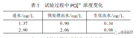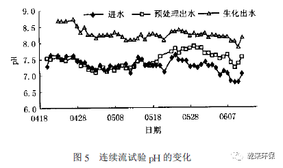 2. 4. 3 預(yù)處理工藝對(duì)p~ 的影響:從圖5 可以看出,生化出水的p~ 有所提高,但相對(duì)傳統(tǒng)的鐵碳法來(lái)說(shuō),提高的幅度不很大。在預(yù)處理過(guò)程中,F(xiàn)e 被氧化成Fe2 + 。在生化段好氧曝氣的過(guò)程中,分子態(tài)的氧繼續(xù)氧化Fe2 + ,p ~得到提高。化學(xué)反應(yīng)如下:4Fe2+ + O2 + H2O →4Fe3+ + 4OH-隨著Fe2 + 的氧化,pH升高。而pH的升高,又促使三價(jià)鐵沉淀: