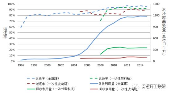 芬蘭的押金體系實(shí)現(xiàn)了極高的回收率。在PALPA體系剛剛成立的1996年,一次性金屬罐的回收率就已經(jīng)達(dá)到了59%,并馬上于第二年上升到了79%。到了2009年,金屬罐的回收率已經(jīng)超過90%。同樣地,PET瓶的押金體系在2008年開始實(shí)施時(shí),返還率就已經(jīng)達(dá)到了71%,之后在兩年內(nèi)便上升到了90%以上。玻璃瓶在芬蘭擁有很長的押金制度實(shí)施積累,因此在PALPA在建立針對玻璃瓶的回收體系后,回收率就一直高于80%。從圖11還可以看出,一次性鐵罐的回收量自2004年起至2012年,一直都在迅速上升,并且保持穩(wěn)定的高回收率,反映出芬蘭飲料產(chǎn)業(yè)使用一次性金屬罐替代可重復(fù)使用玻璃瓶的趨勢??芍貜?fù)使用玻璃瓶的回收率則更高,在2014年時(shí)為97%、2015年時(shí)為98%。