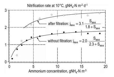 但是Gujer教授也承認(rèn),雖然這個(gè)模型一方面對(duì)開發(fā)新工藝技術(shù)很有幫助,但是他們當(dāng)時(shí)也意識(shí)到模型的局限性——在縮減的空間和時(shí)間里,它并不能將實(shí)際工程應(yīng)用的方方面面都成功模擬。例如下圖,中試實(shí)驗(yàn)顯示經(jīng)過無硝化高效生物處理后的生物濾池三級(jí)處理的硝化情況顯示過濾截留了二級(jí)處理出水中的懸浮固體,但是在實(shí)際應(yīng)用中卻不是這樣。